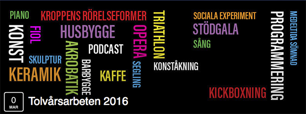 Under klass 12 – tredje gymnasieåret – avslutar eleven sin skolgång med ett eget valt och bearbetat ämne som kan vara husbygge, kaffe, dataprogrammering, keramik, podcast och oändligt mycket mer.