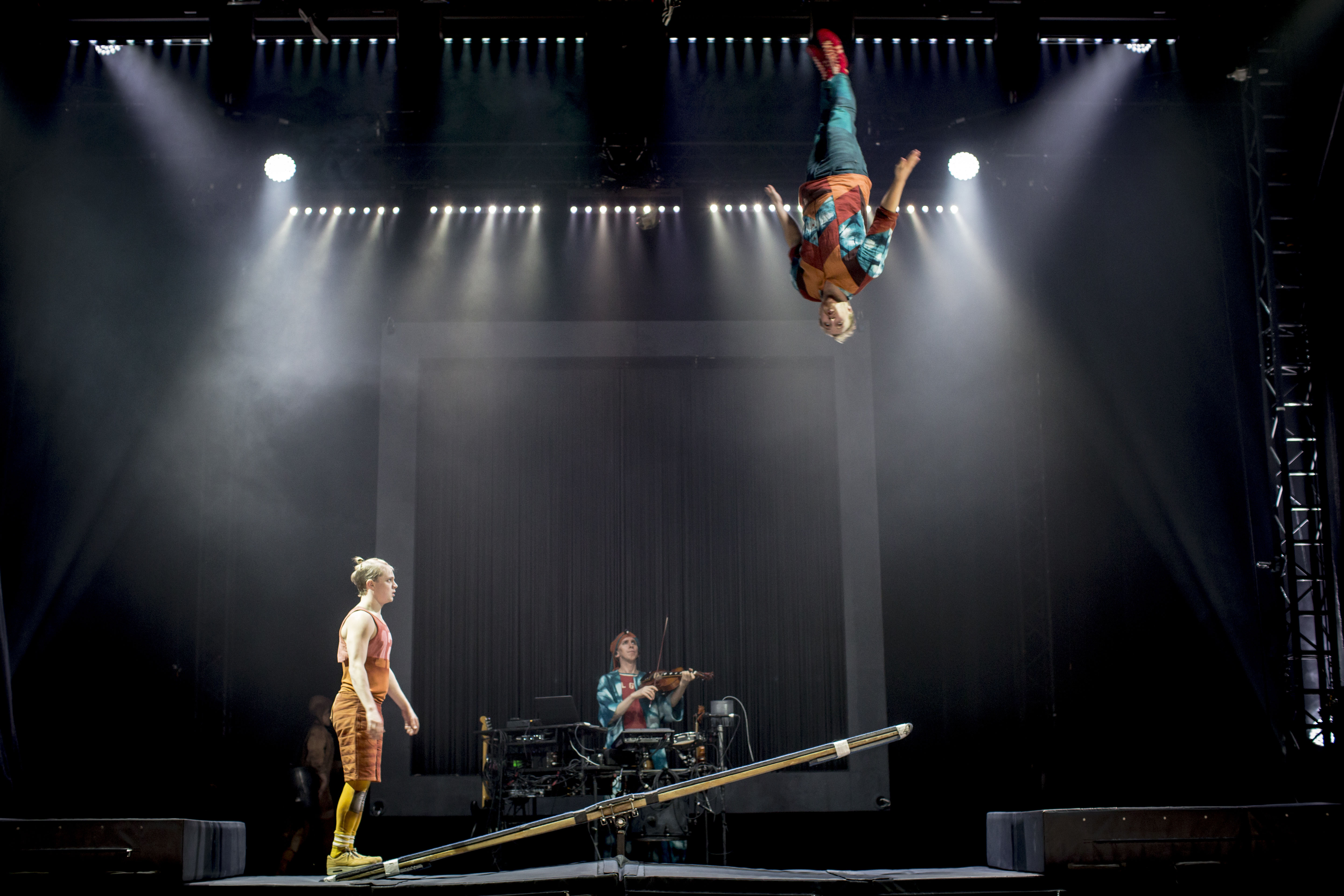 Bilden vi har på hela vår hemsida är tagen av den fantastiske fotografen Mats Bäcker och visar en glimt av föreställningen Limits med Samuel med sin fiol och Anton och Einar på sin språngbräda – som hela föreställningen: Hisnande